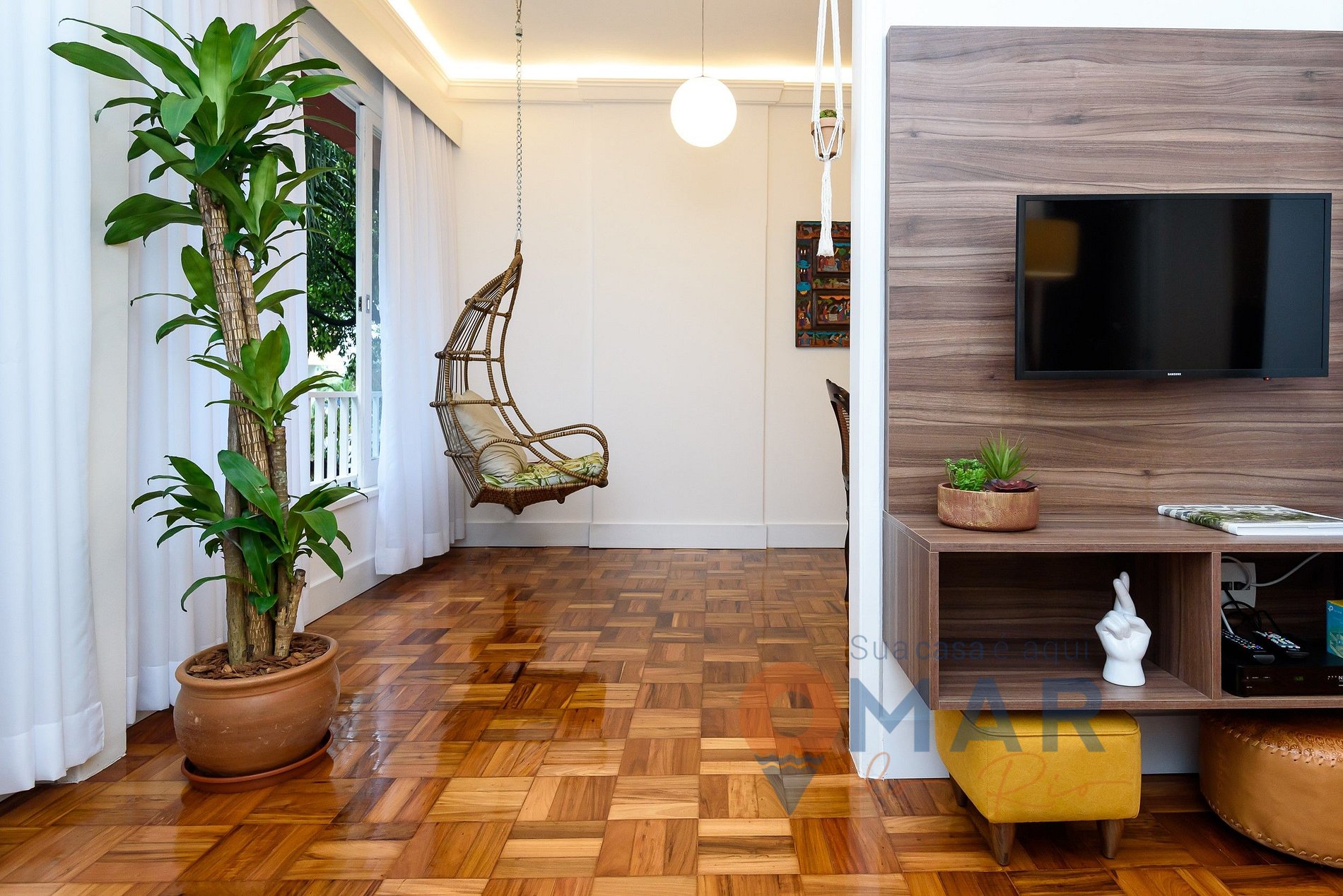 Sala: sofá-cama, ar condicionado split, , Smart TV, mesa de jantar com 6 cadeiras, cadeira de balanço suspensa, tomada com entrada direta para USB.