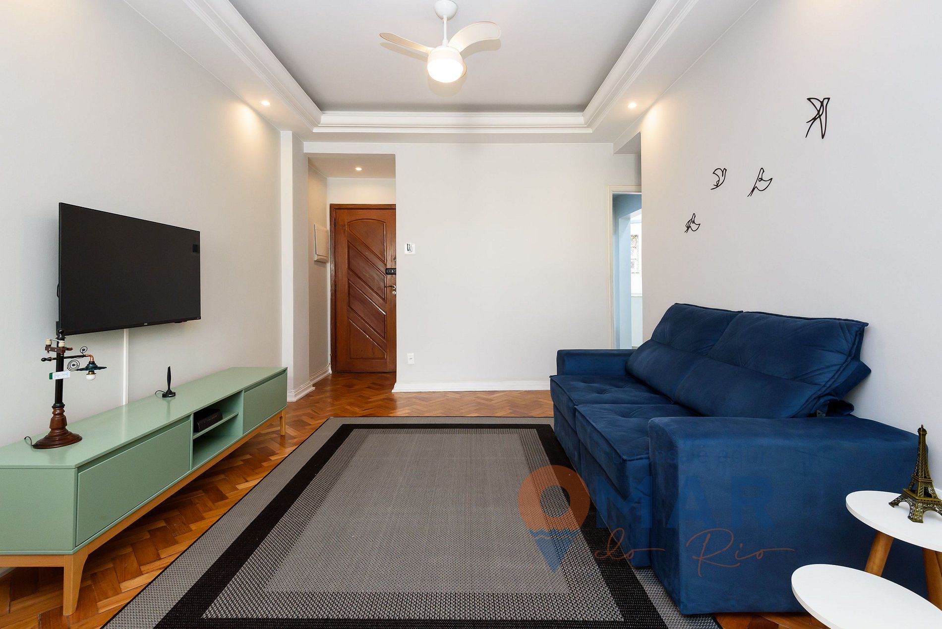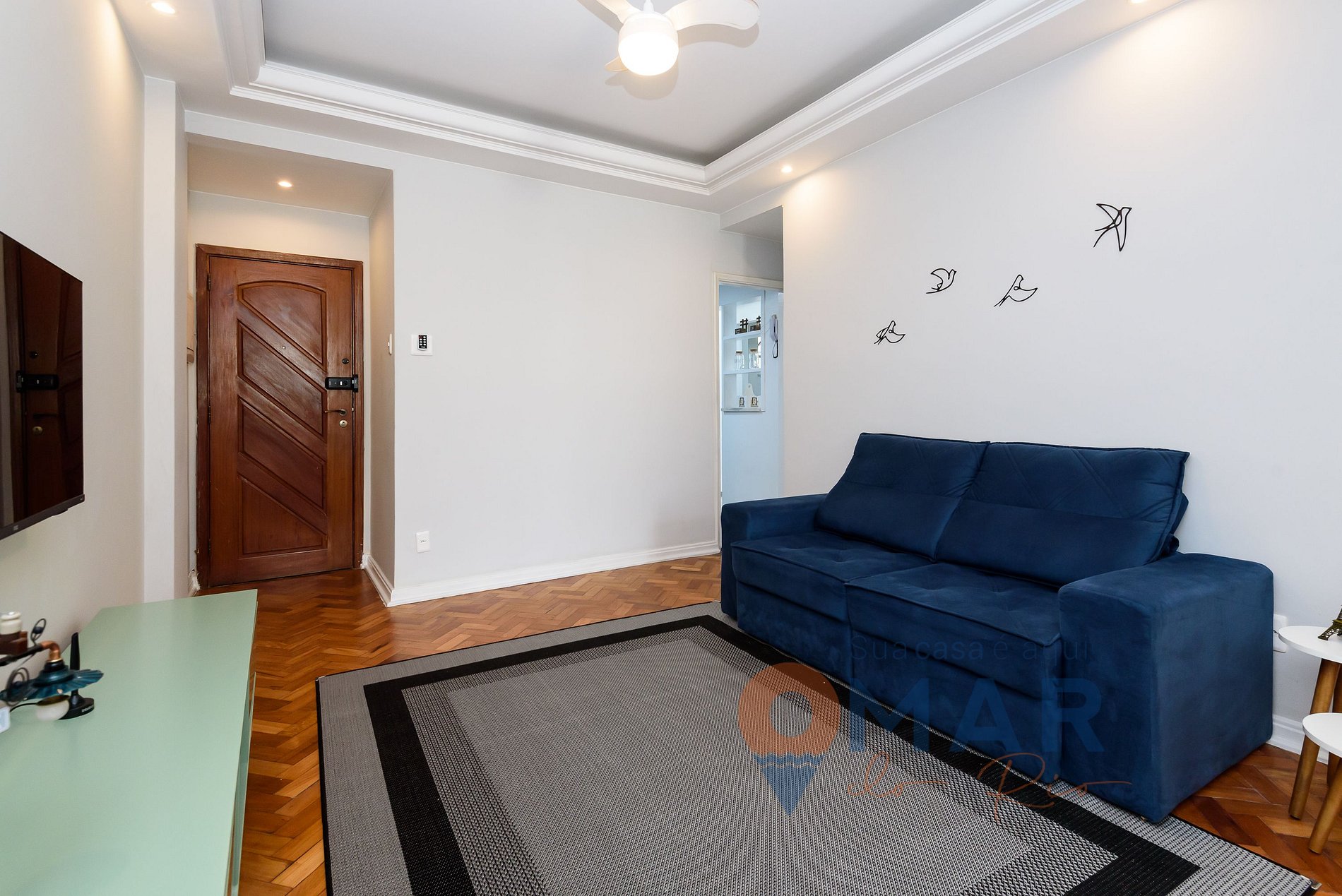 Sala: Sofá, Smart TV, canais abertos, mesa de jantar e cadeiras, ventilador e poltrona.