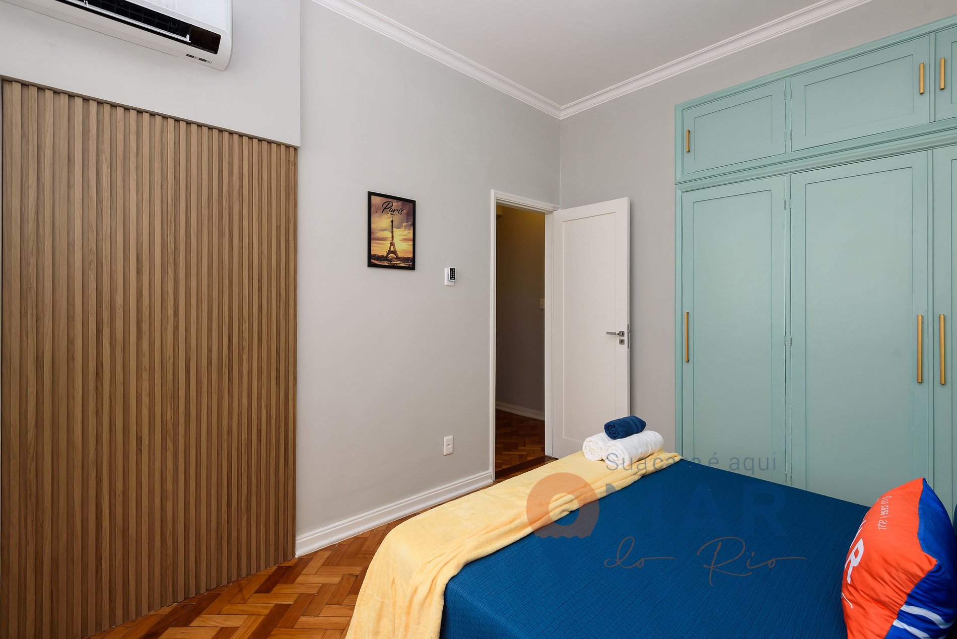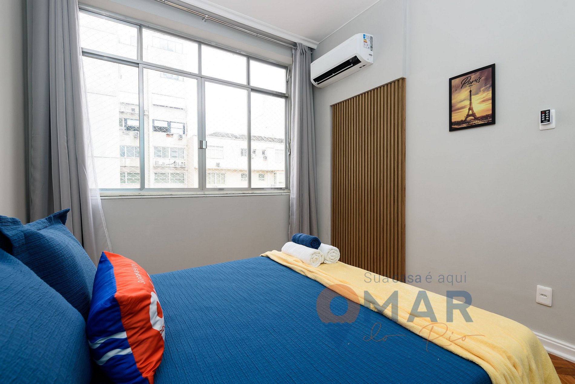 Quarto 2: Cama casal (188cm x 138cm), ar condicionado split, armário e blackout.
