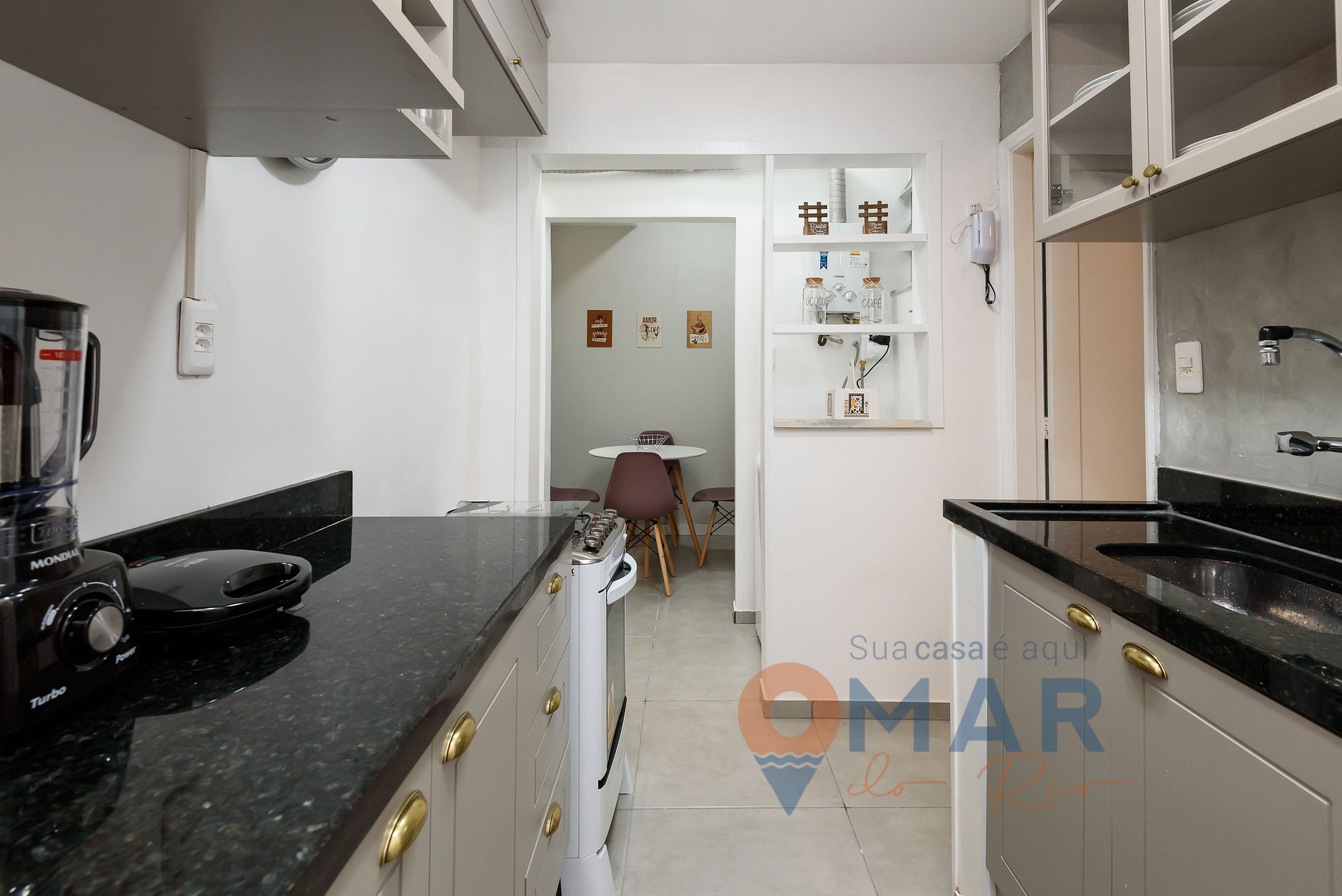 Cozinha: Fogão, geladeira, micro-ondas, máquina de café, mesa de jantar com cadeiras, liquidificador e itens de cozinha.