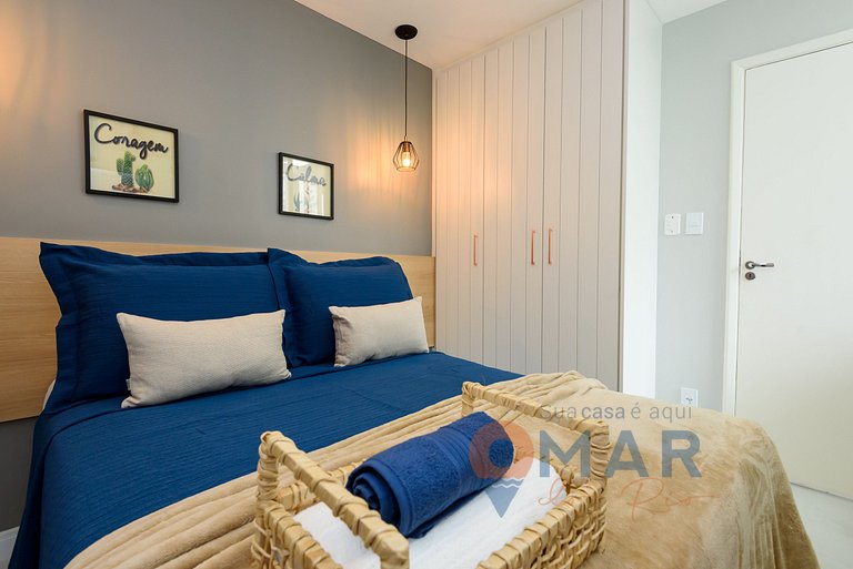 Quarto: Cama Queen Size (198cm x 158cm), Smart TV, ar-condicionado split, armário com cabides, espelho de corpo inteiro e persiana blackout.