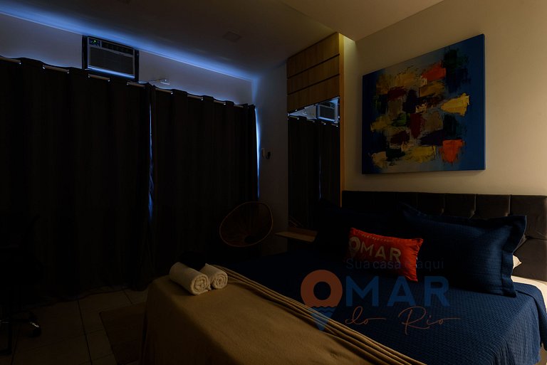 Quarto: cama Queen Size (198cm x 158cm), ar-condicionado, Smart TV com canais abertos, armário fechado com cabides, cortina blackout, estação para trabalho (workstation) e rede de descanso.