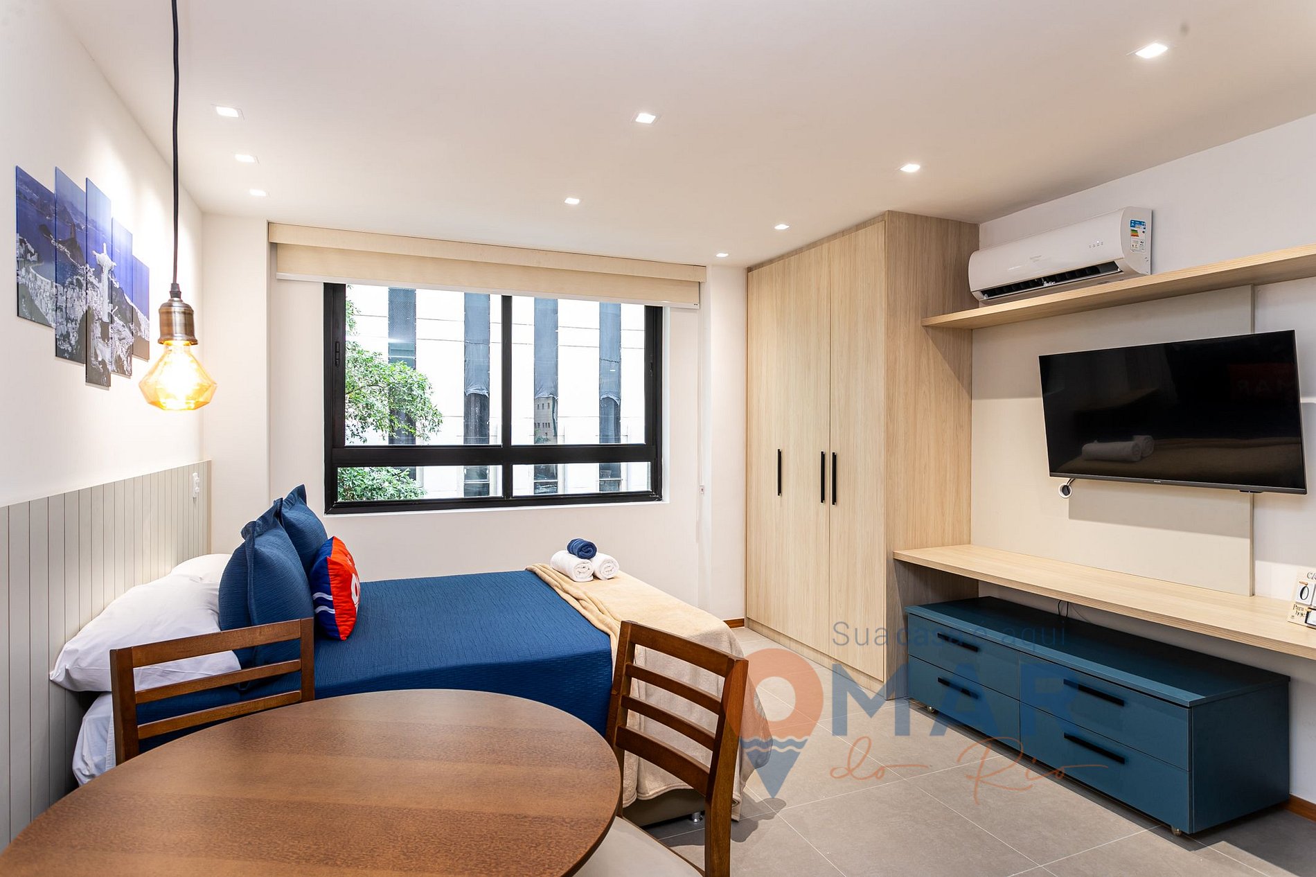 Estúdio: cama Casal padrão (188cm x 138cm), ar condicionado, Smart TV com canais a cabo, mesa de jantar + assentos, armário fechado, cabides e cortina blackout.
