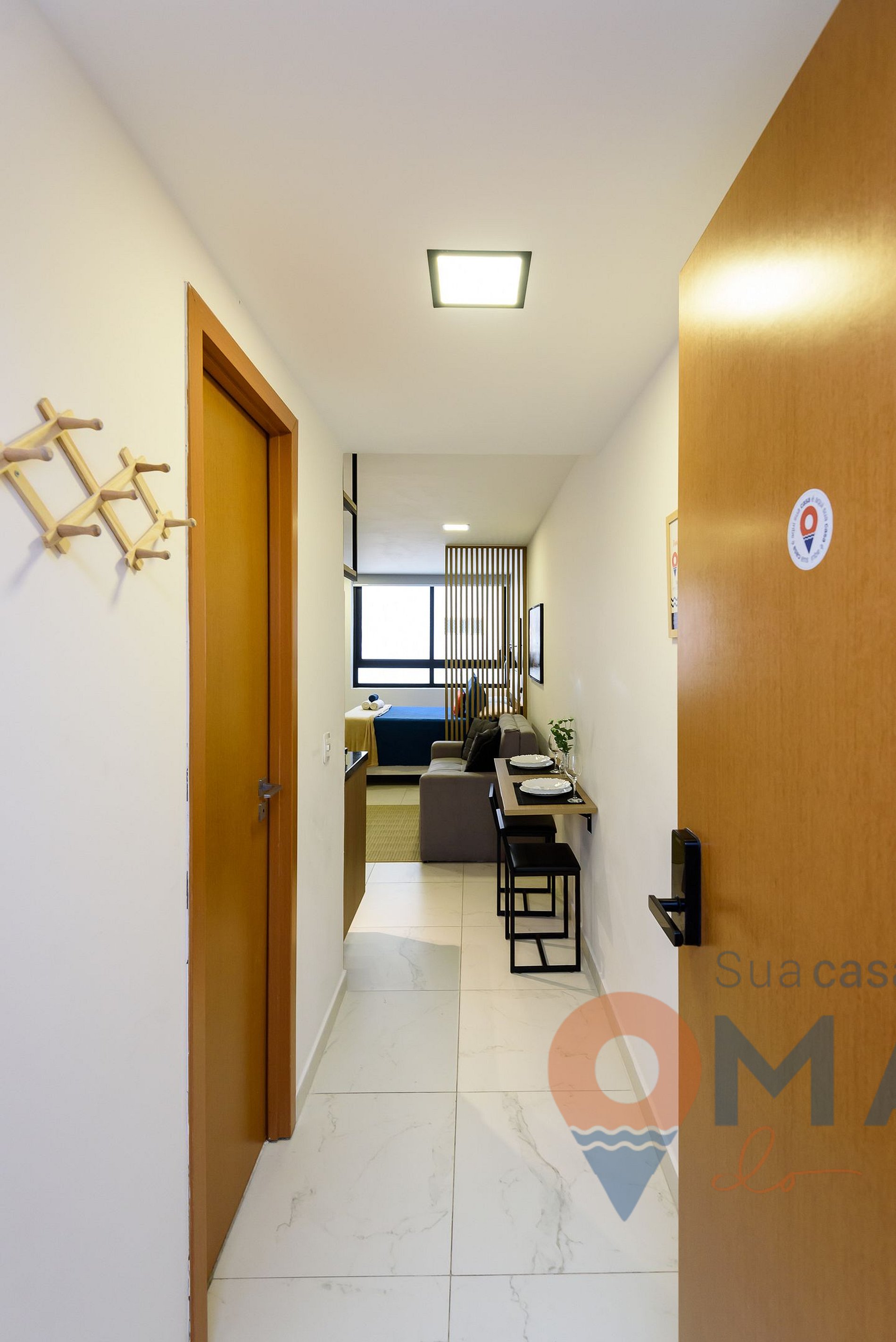 Estúdio: cama casal padrão (188cm x 138cm), sofá, ar-condicionado split, Smart TV 50" com canais abertos (antena digital), estação para trabalho (workstation), bancada com 2 banquetas, guarda-roupa com cabides, cortina blackout e espelho de corpo inteiro.