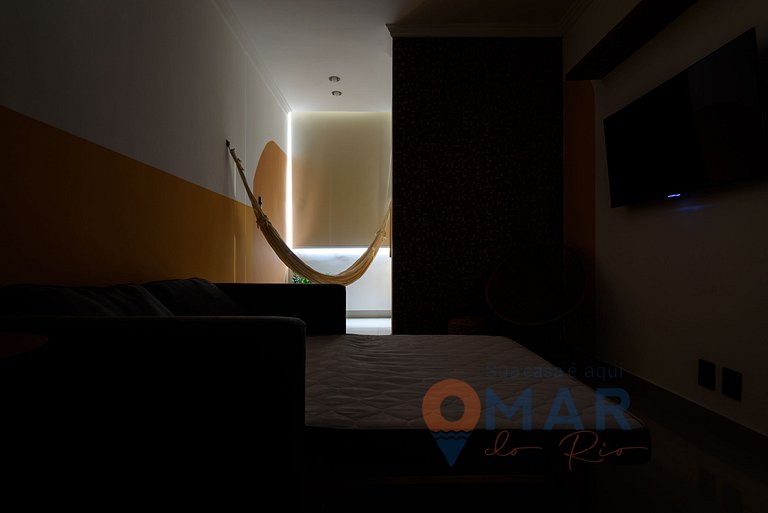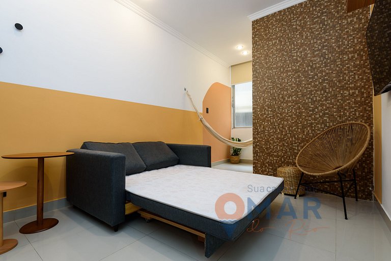 Sala: Sofá-cama (88x124x185cm),TV com canais a cabo, rede e cortina.