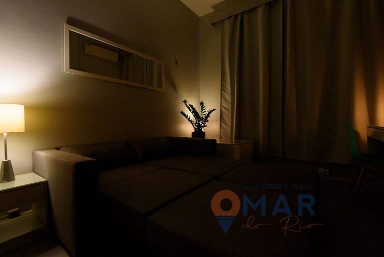 Quarto: Cama casal queen size (198cm x 158cm), sofá-cama casal, ar-condicionado, ventilador de teto, cortina blackout, smart TV com canais a cabo e workstation.