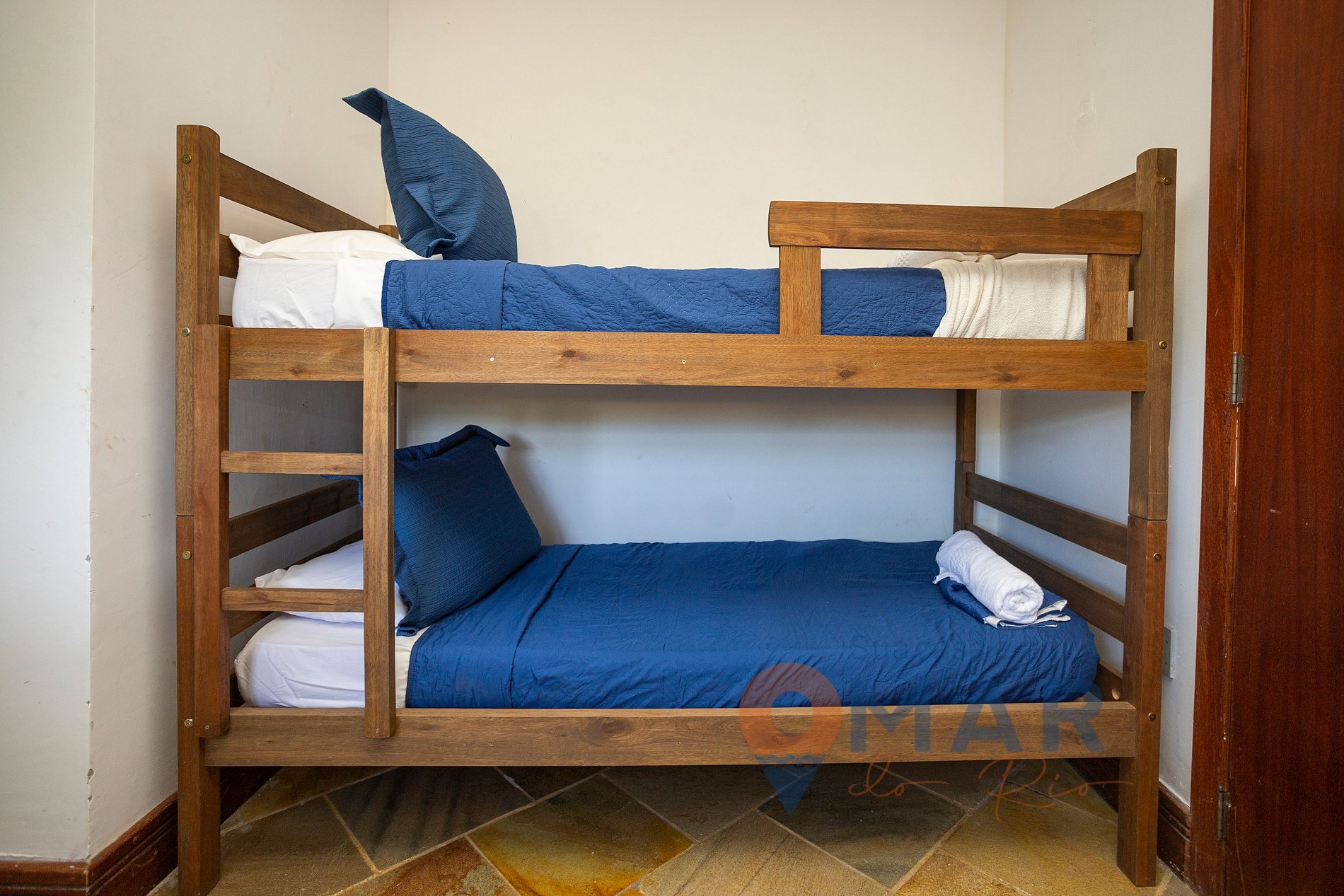 Quarto 4: Cama de solteiro (188cm x 88cm) e cama beliche, ar-condicionado, armário aberto e persiana blackout.