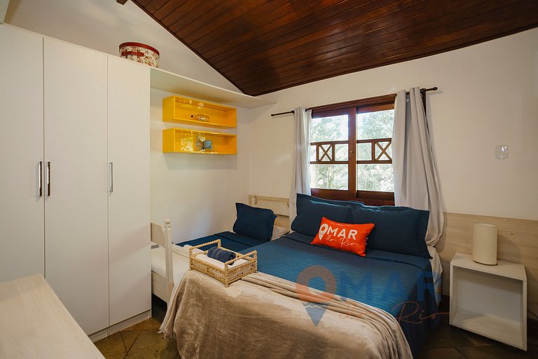 Suíte 2 (2º andar): Cama casal padrão (188cm x 138cm) + cama de solteiro (188cm x 88cm), ar condicionado, ventilador de teto, armário.